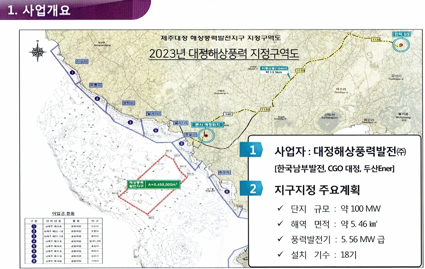 또한 대정해상풍력발전단지가 공사에 들어갈 경우 미치게 될 부정적인 영향은 대정읍 해양생태계 전반에 이르게 될 것이므로 일부 마을 주민총회 결과만으로 이 사업을 원안 그대로 재추진하는 것도 맞지 않다. 육지 행정구역이 동일리이더라도 마을어장을 벗어난 바다의 풍력발전지구는 일과리, 하모리를 넘어 대정읍 일대에 넓게 걸친다고 보아야 할 것이므로 어느 한 마을이 찬성했다고 해서 전체 도민의 의사를 대변한다고 볼 수 없다. 이미 도의회의 반대로 종결된 사업을 일부 주민들에 대한 보상금 지급이라는 우회경로를 통해 재추진하는 것 역시 심각한 결격사유에 해당한다.