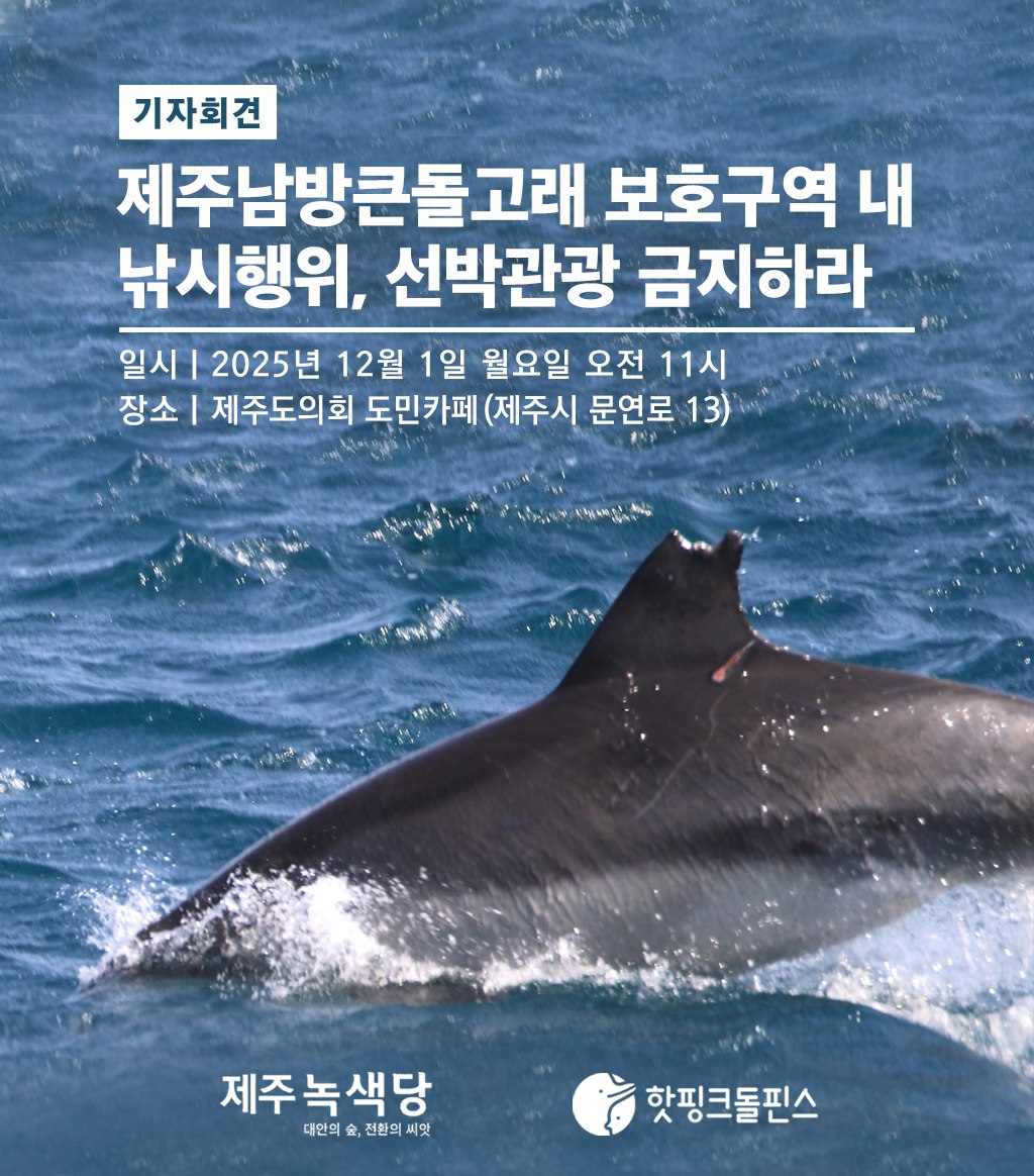 이에 국제보호종 제주남방큰돌고래가 바다에서 안전하고 건강하게 살아갈 수 있도록, 또 그들의 멸종을 늦출 수 있도록 서귀포시 대정읍 신도리 ‘해양생물보호구역’ 내 낚시행위와 선박관광을 금지할 것을 촉구하는 기자회견을 12월 1일 월요일 오전 11시 제주도의회 도민카페에서 개최합니다. 많은 관심과 참여 바랍니다.