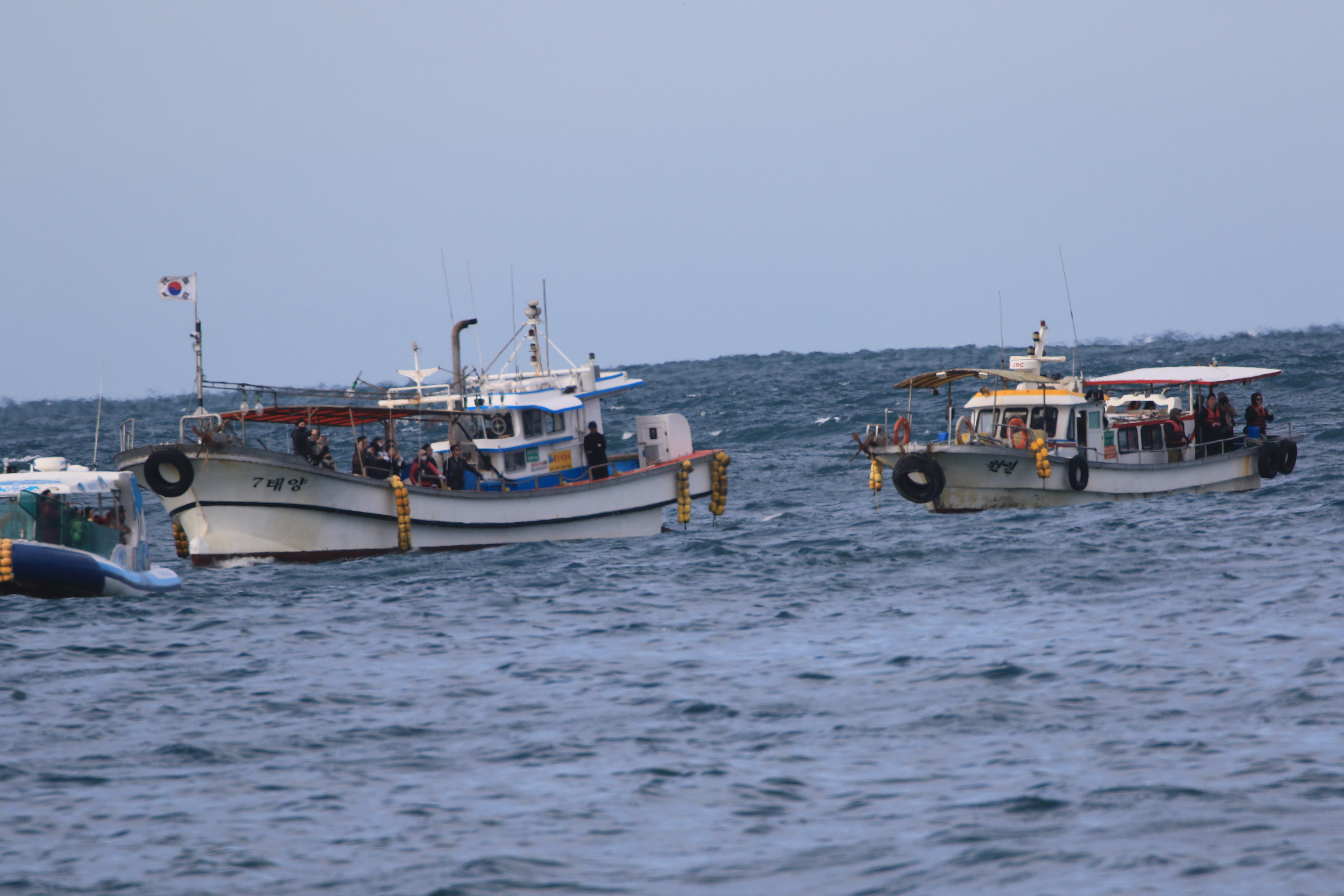 ▲2025년 11월 11일 오전 10시 37분 경 서귀포시 대정읍 신도리 남방큰돌고래 해양생물보호구역 내에서 선박 3척이 동시에 돌고래 대상 관광을 하고 있다. 이날은 핫핑크돌핀스와 대정읍 무릉초등학교 학생들 및 교사들이 함께 남방큰돌고래 생태관찰을 진행하고 있었는데, 많은 선박들이 동시에 남방큰돌고래 무리에 다가가는 모습을 보며 눈살을 찌푸리기도 했다. 또한 2척이 넘는 선박이 동시에 보호종 돌고래를 대상으로 한 관광을 할 수 없다고 명시한 해양생태계의 보전 및 관리에 관한 법률에 따라 이런 행위는 규정 위반에 해당하고 행정에서 최대 200만원의 과태료를 부과해야 하는데, 규제는 전혀 이뤄지지 않고 있다. 사진 = 핫핑크돌핀스 |
