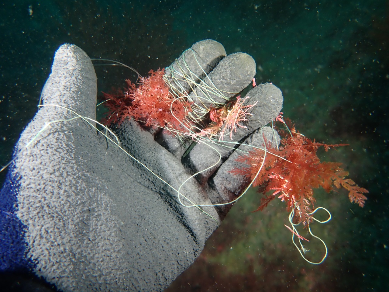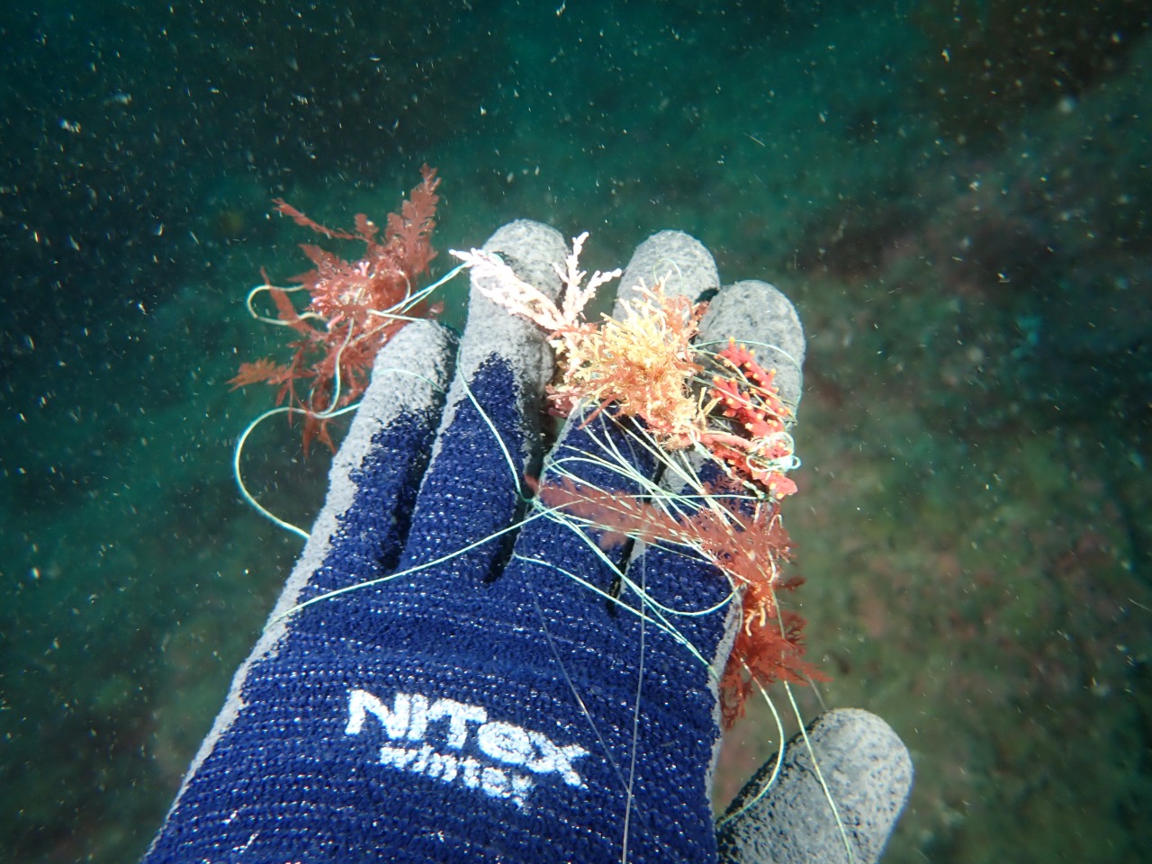 ▲신도리 바다 일대가 해양생물보호구역으로 지정되었으나, 낚시 제한이나 수중 폐어구 수거 등의 적극적인 추가 조치는 전혀 이뤄지지 않고 있다. 인간이 버린 바다쓰레기에 걸려 죽어가는 생명들을 보며 이대로 방치할 수는 없어서 핫핑크돌핀스 활동가들이 직접 바다 속에 들어가 수중에 버려진 채 방치된 폐낚싯줄, 폐낚시바늘 등을 지속적으로 수거하고 있다. 사진 = 핫핑크돌핀스 |
