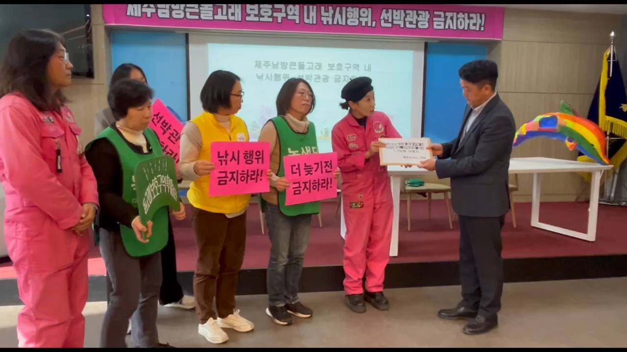 1. 제주녹색당, 정의당 제주도당, 해양환경단체 핫핑크돌핀스는 2025년 12월 1일 월요일 오전 11시 제주도의회 도민카페에서 기자회견을 열고 1,750명이 서명한 "제주남방큰돌고래 보호구역 내 낚시행위, 선박관광 금지하라" 서명지를 오영훈 제주도지사(담당 해양산업과장)에게 제출하였습니다. 공동 기자회견문은 아래 첨부합니다.
